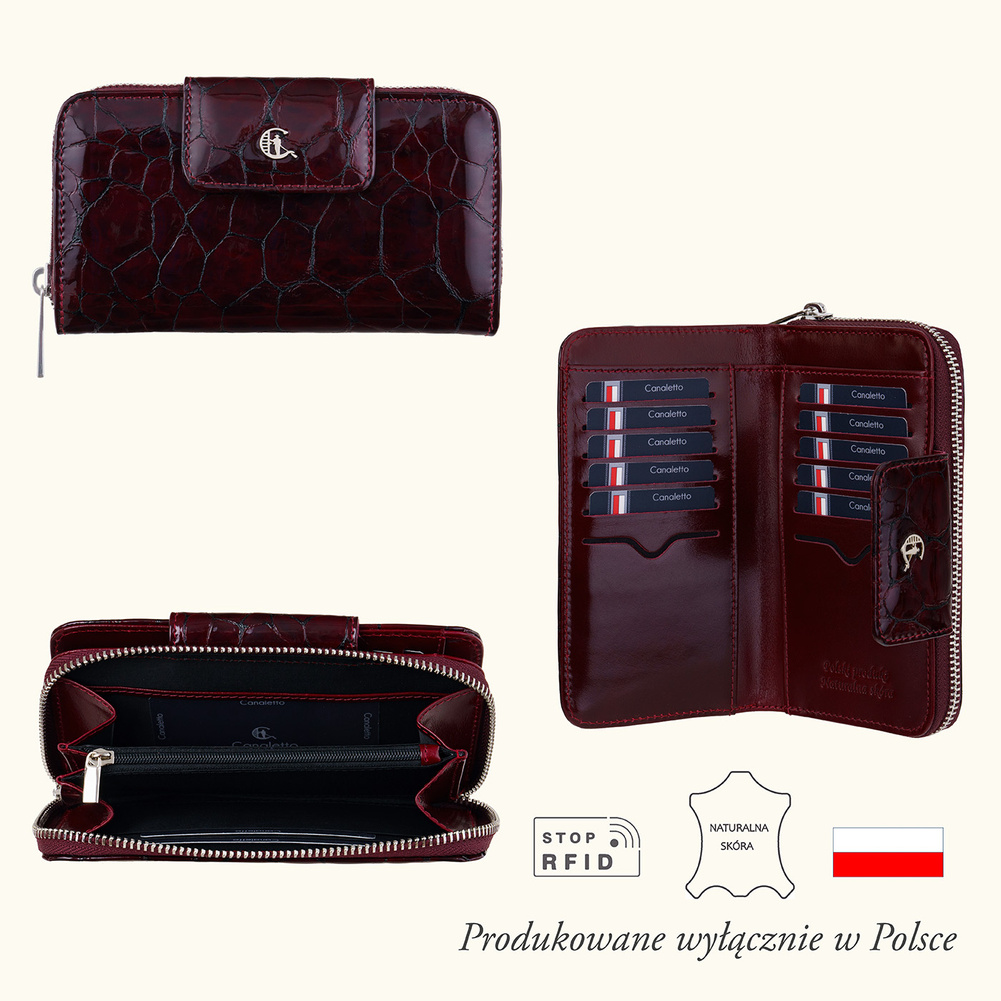 Portfel damski Canaletto z bordowej lakierowanej skóry to inwestycja w produkt, który łączy piękno, funkcjonalność i nowoczesne technologie. To więcej niż dodatek – to element, który podkreśla Twój styl i indywidualność.