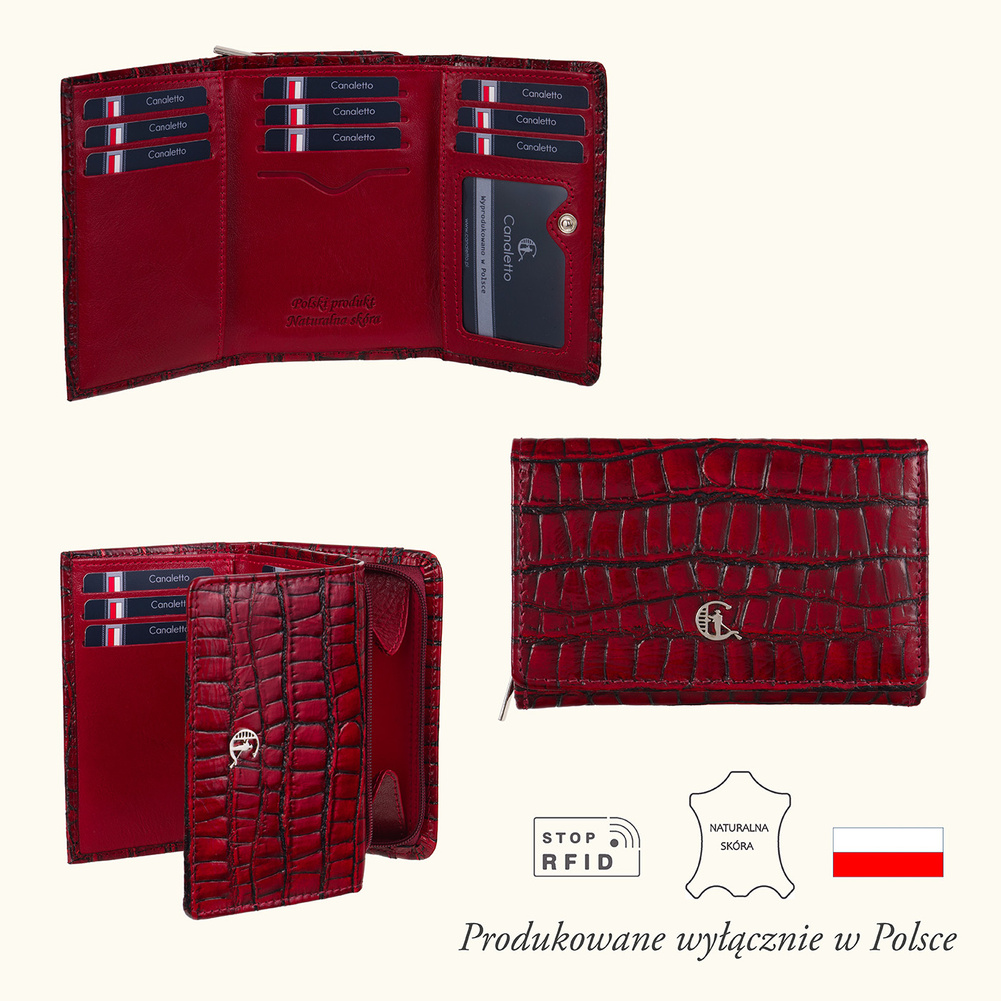 Poznaj wyjątkowy portfel damski Canaletto, wykonany z naturalnej skóry licowej o tłoczeniu przypominającym krokodylą fakturę. Głęboka, elegancka czerwień podkreśla luksusowy charakter portfela, czyniąc go nie tylko praktycznym dodatkiem, ale również elementem, który doda wyrazistości każdej stylizacji. Dzięki ręcznemu wykonaniu w rodzinnej manufakturze oraz zastosowaniu nowoczesnej ochrony RFID, portfel zapewnia najwyższą jakość, bezpieczeństwo i niezrównaną trwałość.