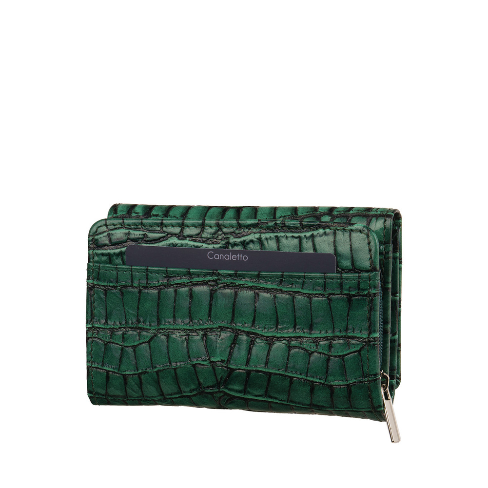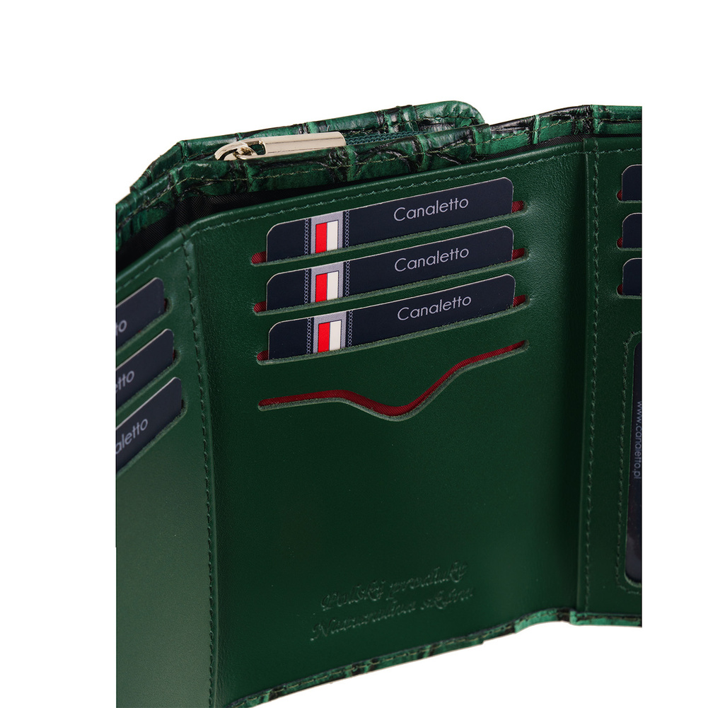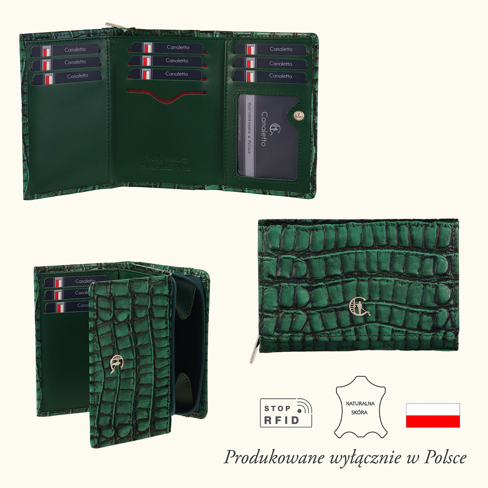 Poznaj wyjątkowy portfel damski Canaletto, wykonany z naturalnej skóry licowej o tłoczeniu przypominającym krokodylą fakturę. Głęboka, elegancka zieleń podkreśla luksusowy charakter portfela, czyniąc go nie tylko praktycznym dodatkiem, ale również elementem, który doda wyrazistości każdej stylizacji. Dzięki ręcznemu wykonaniu w rodzinnej manufakturze oraz zastosowaniu nowoczesnej ochrony RFID, portfel zapewnia najwyższą jakość, bezpieczeństwo i niezrównaną trwałość.