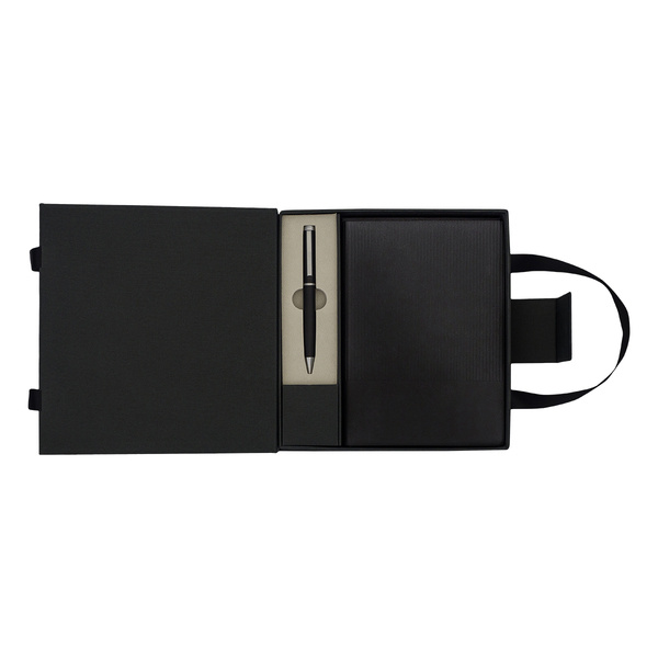 Zestaw składający się z notesu A5 (80 kartek w linie, 80 g/m2) i długopisu z niebieskim wkładem.