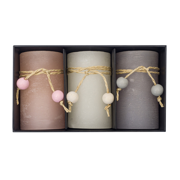 Zestaw świec zapachowych (zapach wanilii, tulipany oraz róży i czarnego pieprzu) w upominkowym pudełku.