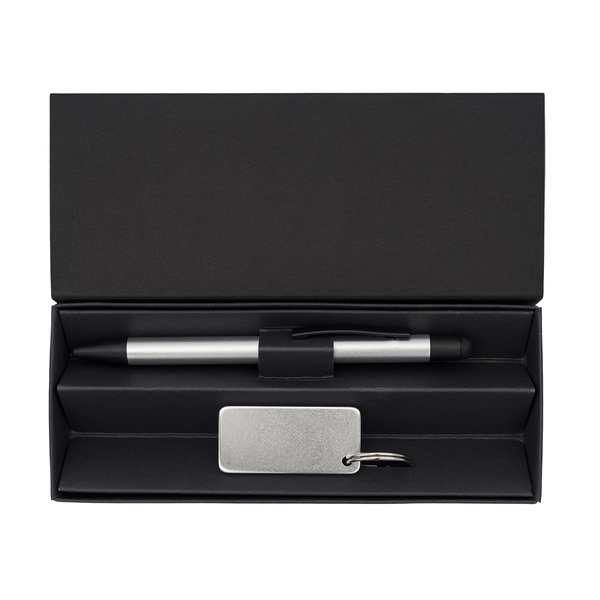 Zestaw promocyjny składający się z długopisu i breloczka wykonanych z aluminium pochodzącego z recyklingu.