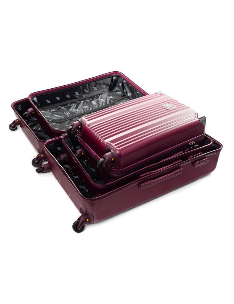 Zestaw walizek podróżnych składa się z trzech rozmiarów bagażu; duży, średni i mały (kabinowy)