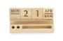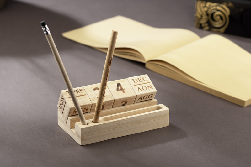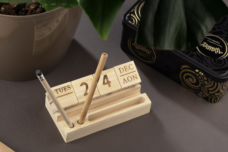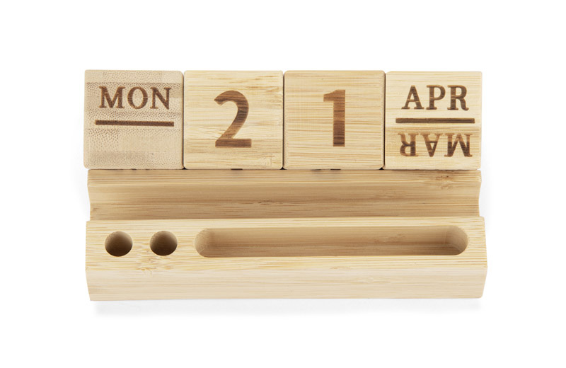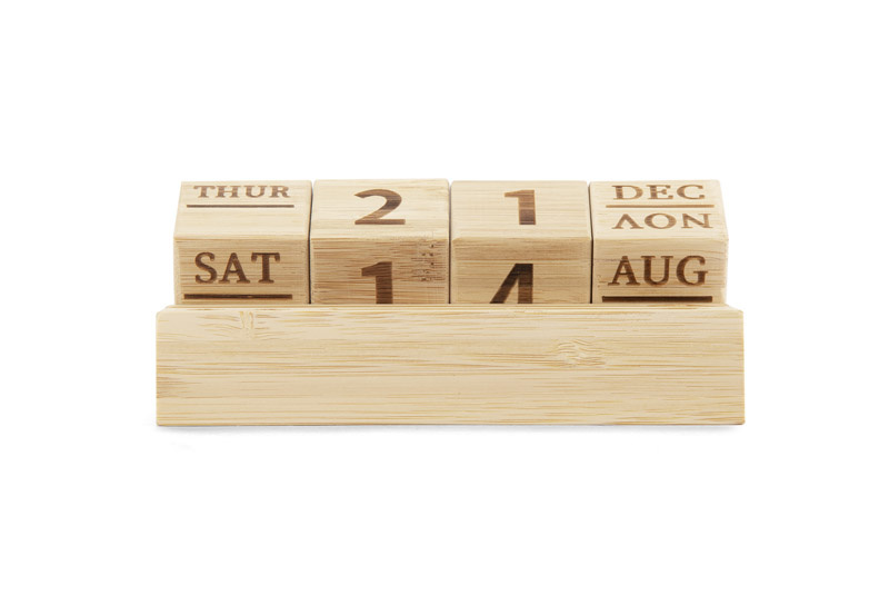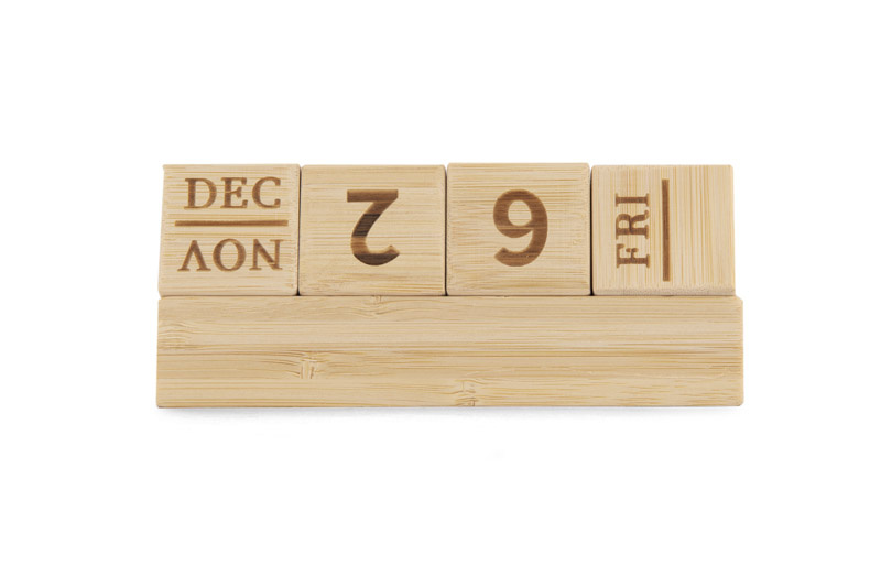 Kalendarz wyposażony jest w bambusowe klocki wskazujące nazwę dnia tygodnia, dzień miesiąca oraz nazwę miesiąca.
