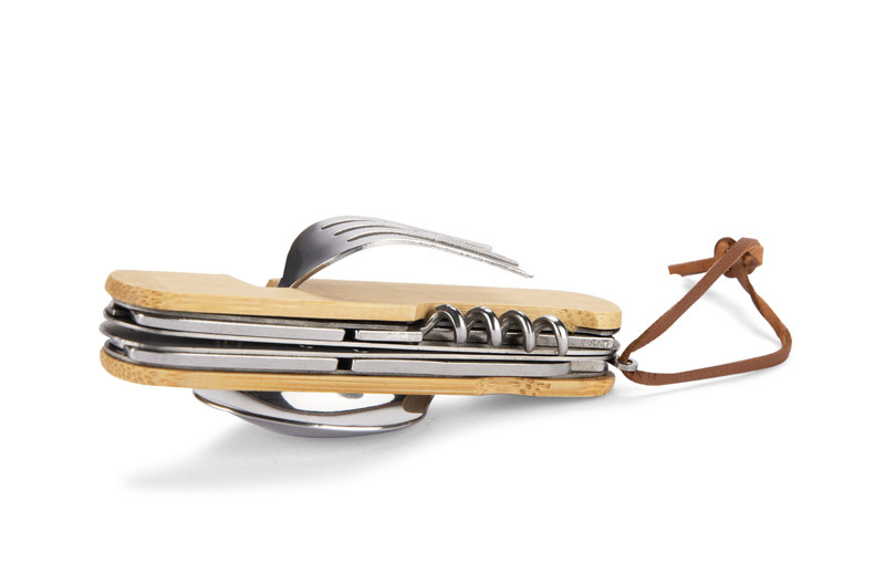 Sztućce turystyczne KENTO to wszechstronny zestaw idealny na wypady outdoorowe, wyposażony w nóż, widelec, łyżkę, korkociąg, otwieracz do butelek oraz śrubokręt.