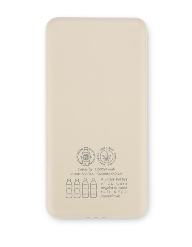 Power bank rPET REPPO o pojemności 10000 mAh wykonany jest z materiału pochodzącego z recyklingu czterech butelek o pojemności 1 litra oraz włókien konopnych.
