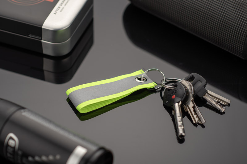 Brelok BLIS to lekki, materiałowy gadżet reklamowy z elementem odbijającym światło, który poprawia widoczność po zmroku.