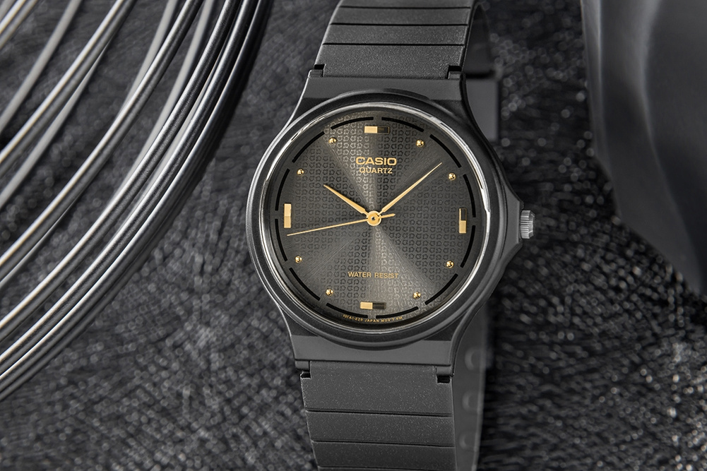 Tarcza zegarka to prawdziwa definicja klasy i nowoczesnej estetyki. Delikatny, geometryczny wzór nadaje jej głębi i subtelnego charakteru, pięknie współgrając z luksusowymi, złotymi detalami. Smukłe wskazówki o lustrzanym wykończeniu delikatnie połyskują przy każdym ruchu nadgarstka, dodając całości wyrafinowanego uroku. Indeksy w postaci złotych prostokątów i drobnych punktów podkreślają elegancki minimalizm, czyniąc zegarek wyjątkowo stylowym dodatkiem na każdą okazję.