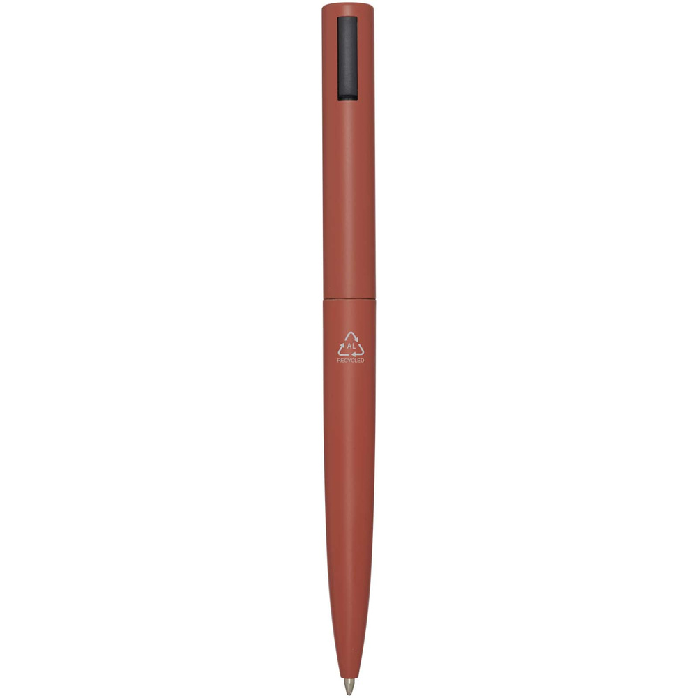 Długopis z górną częścią korpusu wykonaną z tworzyw sztucznych pochodzących z recyklingu i dolną częścią korpusu wykonaną z aluminium pochodzącego z recyklingu. Klips wykonany jest z żelaza. Kolor tuszu: Niebieski. Żywotność: 1000 metrów. Rozmiar stalówki: 1,0 mm.