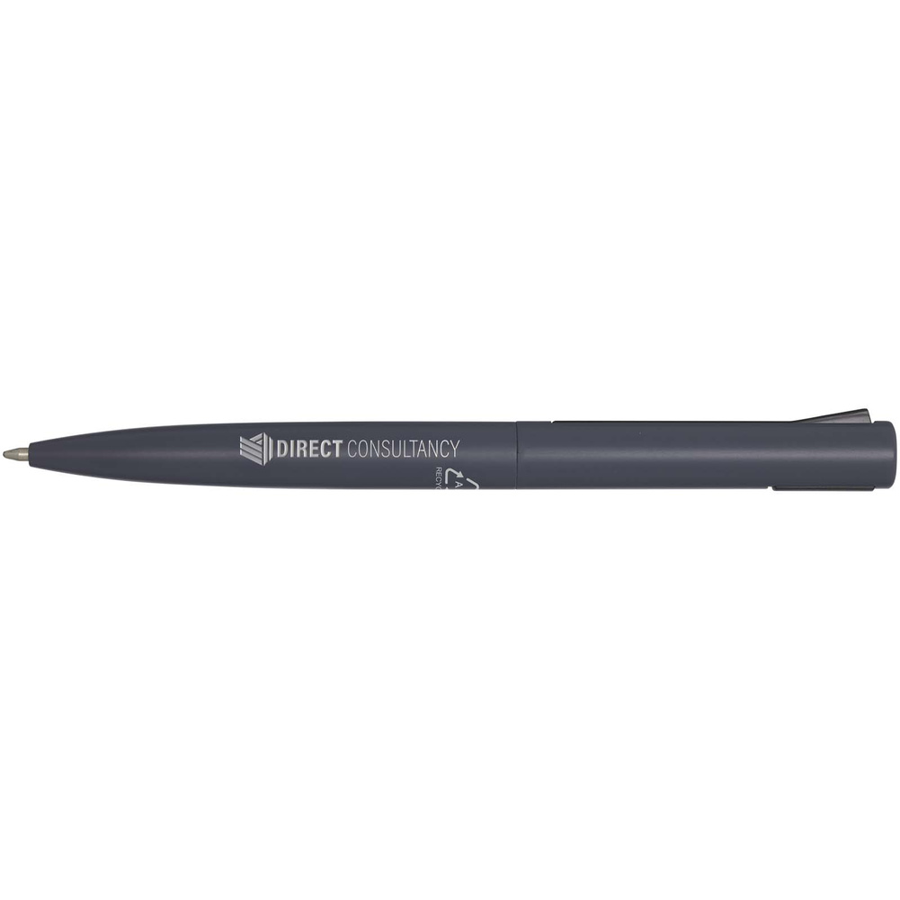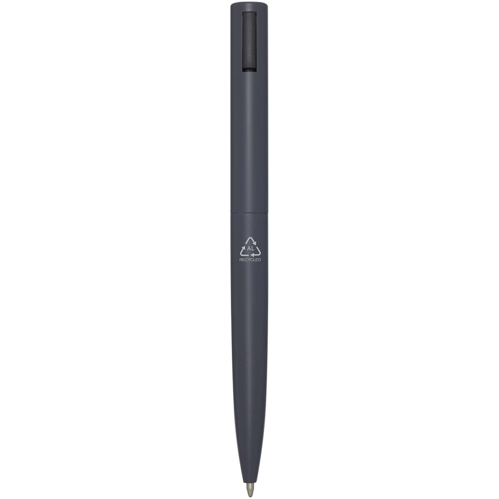 Długopis z górną częścią korpusu wykonaną z tworzyw sztucznych pochodzących z recyklingu i dolną częścią korpusu wykonaną z aluminium pochodzącego z recyklingu.
