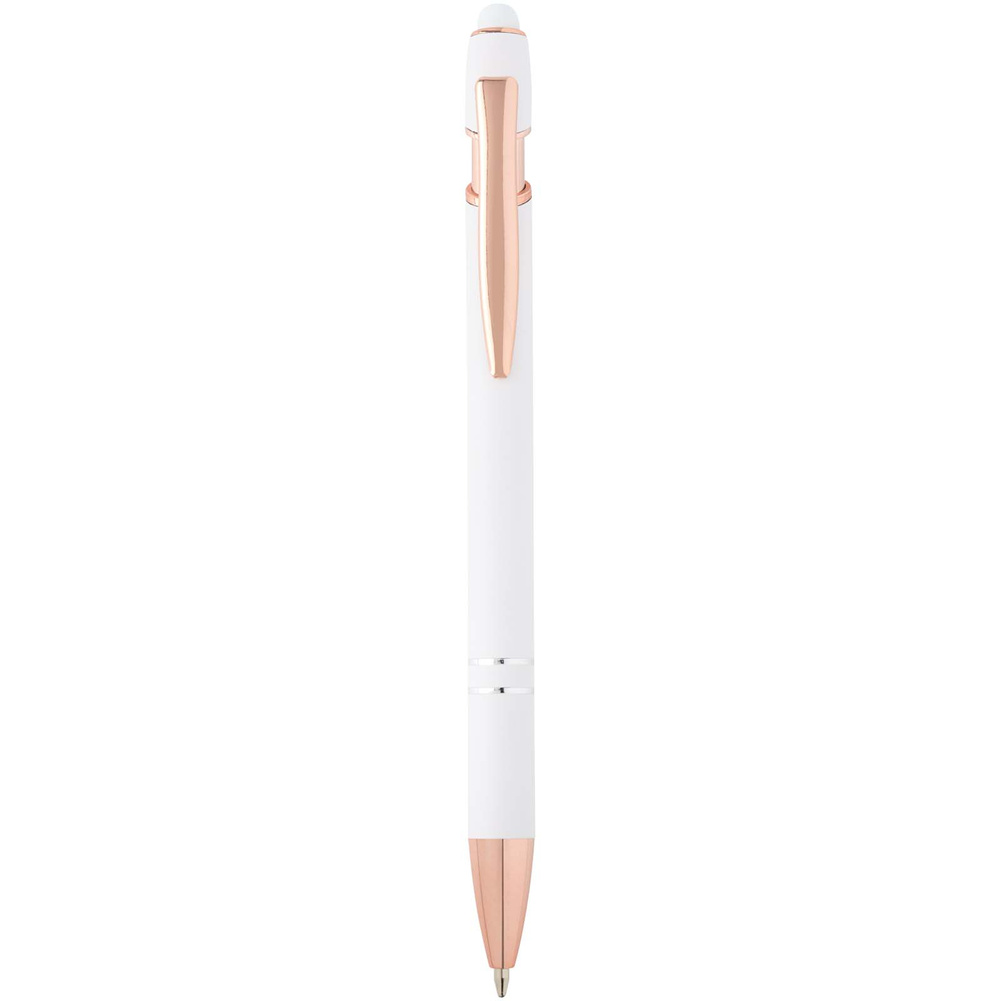 Długopis Nanna z wykończeniem w kolorze różowego złota ma korpus wykonany z aluminium z recyklingu i rysik dotykowy wykonany z silikonu.