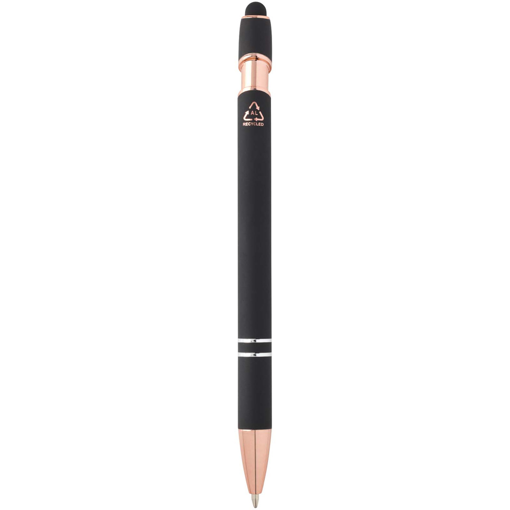 Długopis Nanna z wykończeniem w kolorze różowego złota ma korpus wykonany z aluminium z recyklingu i rysik dotykowy wykonany z silikonu.