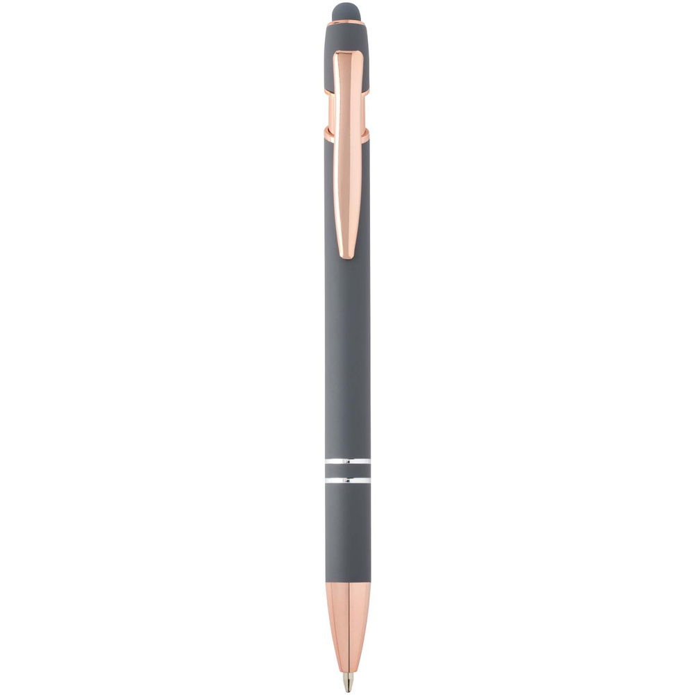 Długopis Nanna z wykończeniem w kolorze różowego złota ma korpus wykonany z aluminium z recyklingu i rysik dotykowy wykonany z silikonu.