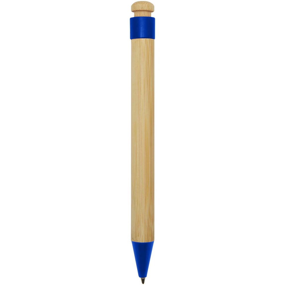 Długopis z klipsem i końcówką z plastiku z recyklingu oraz przyciskiem i korpusem z bambusa.