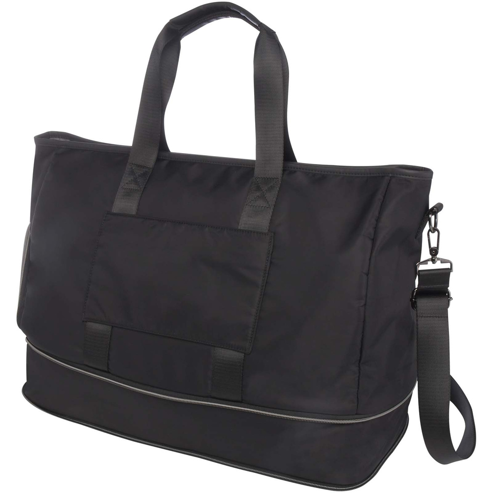 Rozszerzalna torba podróżna Rhine bez trudu przekształci się w stylową torbę na różne okazje dzięki eleganckiemu designowi i wszechstronności. Wysokiej jakości nylon z recyklingu z certyfikatem GRS, miękka podszewka RPET i elementy z najwyższej jakości skóry PU. Torba podróżna ma pojemną komorę główną z dużą, szczelną kieszenią z TPU, 2 kieszenie, specjalną komorę na buty, bezpieczną, ukrytą kieszeń z tyłu (pełniącą również funkcję paska do wózka) oraz odpinane paski na ramiona, które można regulować w celu zapewnienia maksymalnego komfortu. Cechą wyróżniającą tę torbę podróżną jest możliwość zwiększenia jej pojemności do 42 litrów. Pojemność: 35–42 litry. Wytrzymałość do 20 kg. Wolne od PVC.