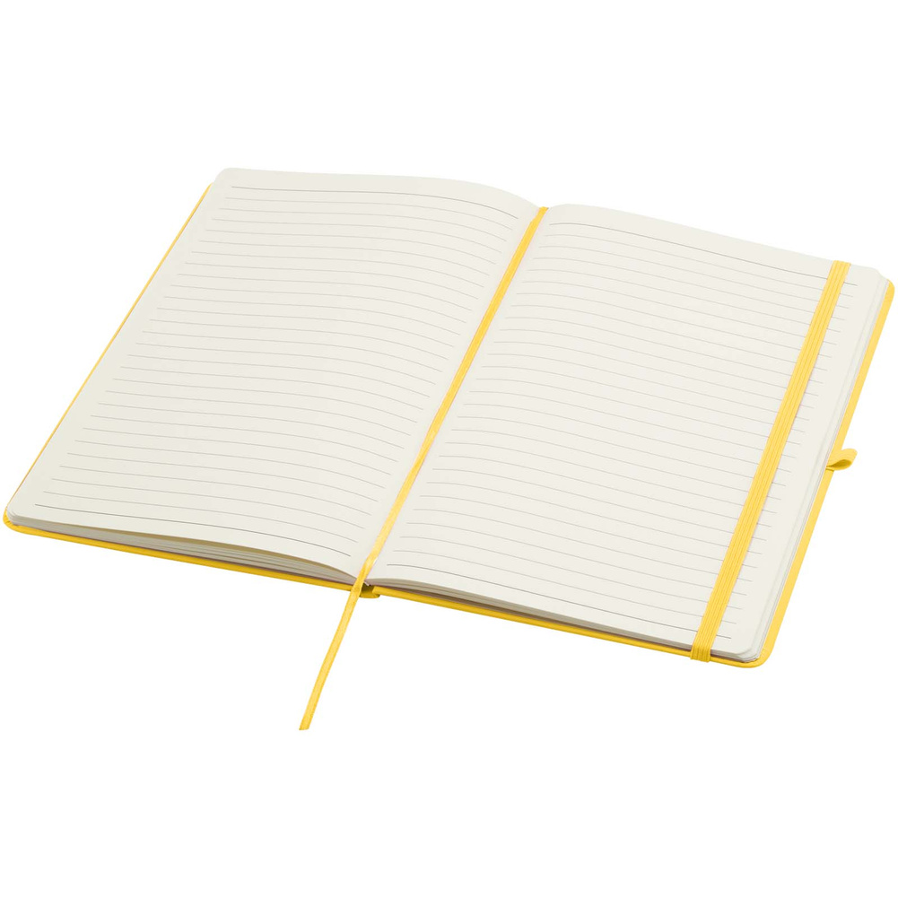 Tekturowy notatnik ma miękką okładkę i 80 liniowanych, kremowych kartek o gramaturze 70 g/m².