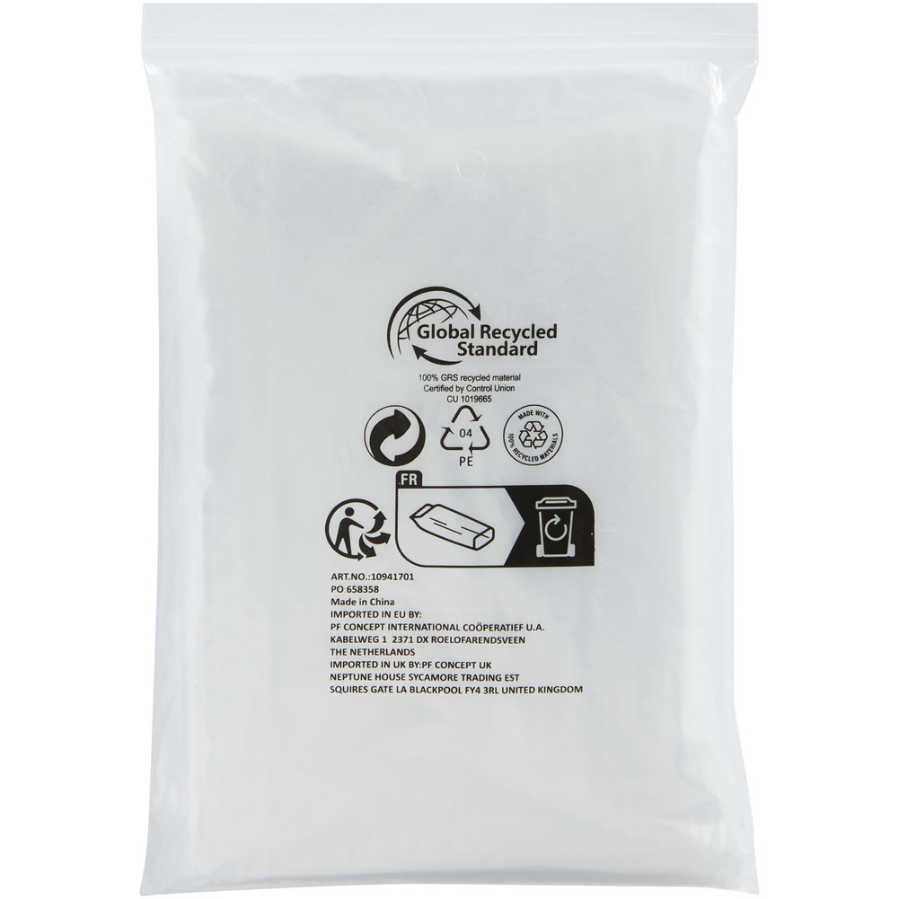 Jednorazowe ponczo przeciwdeszczowe Mayan w uniwersalnym rozmiarze jest wykonane w 100% z tworzywa sztucznego z recyklingu, z certyfikatem GRS.