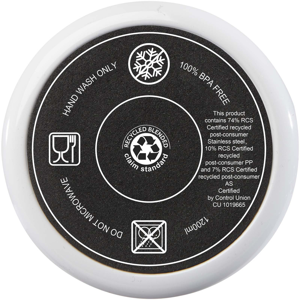 Wewnętrzna ścianka kubka wykonana jest z tworzyw sztucznych pochodzących z recyklingu, a zewnętrzna ze stali nierdzewnej z certyfikatem RCS.