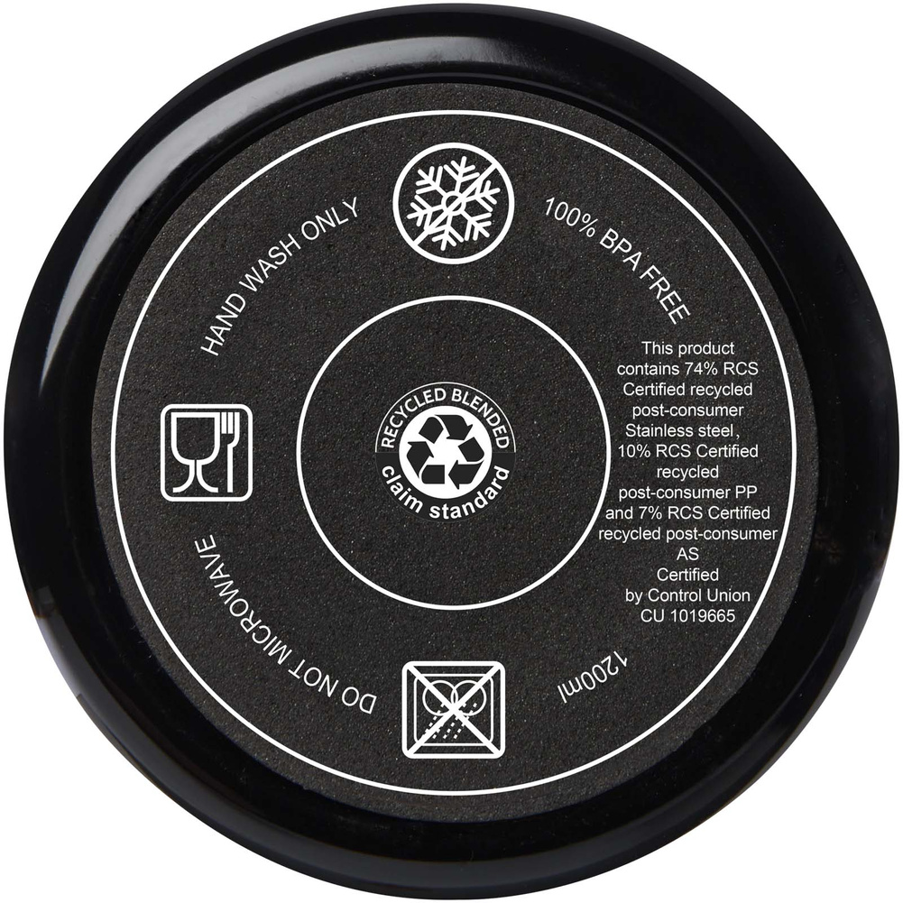 Wewnętrzna ścianka kubka wykonana jest z tworzyw sztucznych pochodzących z recyklingu, a zewnętrzna ze stali nierdzewnej z certyfikatem RCS.
