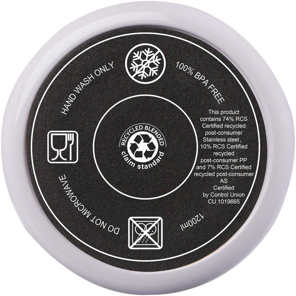 Wewnętrzna ścianka kubka wykonana jest z tworzyw sztucznych pochodzących z recyklingu, a zewnętrzna ze stali nierdzewnej z certyfikatem RCS.