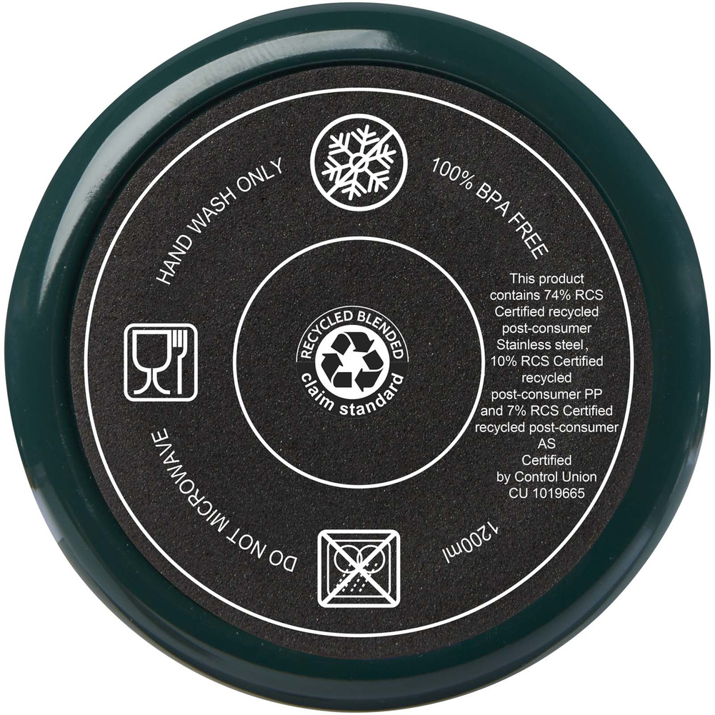 Wewnętrzna ścianka kubka wykonana jest z tworzyw sztucznych pochodzących z recyklingu, a zewnętrzna ze stali nierdzewnej z certyfikatem RCS.
