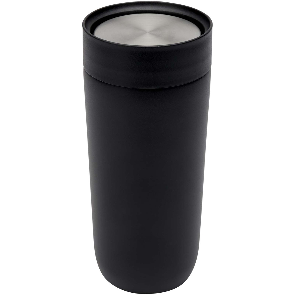 Wysokiej jakości kubek na wynos z poręcznym mechanizmem otwierania typu push-top ze stali nierdzewnej umożliwiającym obsługę jedną ręką.