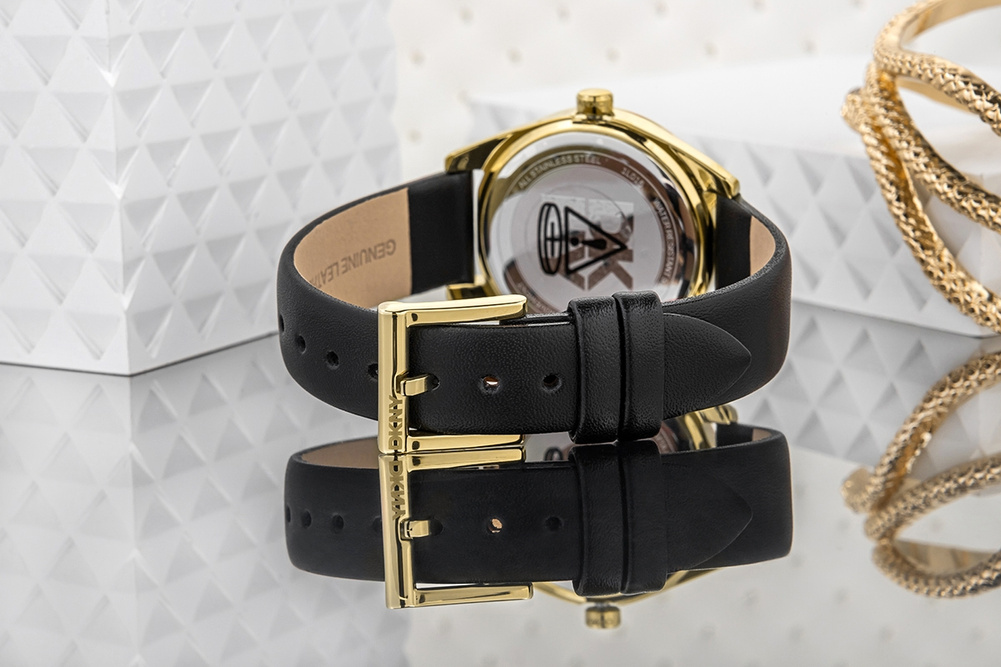 Zegarek DKNY to odważny manifest luksusu, który przyciąga wzrok i podkreśla wyjątkowy styl swojej właścicielki. Złota koperta przyciąga wzrok swoim wyrafinowanym blaskiem, a trójwymiarowe logo DKNY na tarczy dodaje mu nowoczesnej głębi i unikalnego wyrazu. Głębokie czarne tło kontrastuje ze złotymi detalami, tworząc wyjątkowy efekt świetlny, który podkreśla prestiżowy charakter zegarka.