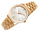 Jasne, satynowe tło o delikatnym promienistym szlifie przyciąga światło, tworząc efekt subtelnego blasku przy każdym ruchu nadgarstka. Wyraziste indeksy w postaci złotych punktów i cyfr arabskich na godzinie 12, 3, 6 i 9 nadają całości lekkości i czytelności, podkreślając klasyczny charakter modelu. Smukłe wskazówki w odcieniu różowego złota płynnie suną po cyferblacie, a stylowy ring na krawędzi tarczy dodaje jej głębi i elegancji. To zegarek, który nie tylko odmierza czas, ale też staje się biżuteryjnym akcentem każdej stylizacji.