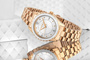 • Wskazówki: różowe złoto – smukłe i wyrafinowane, pasujące do całości