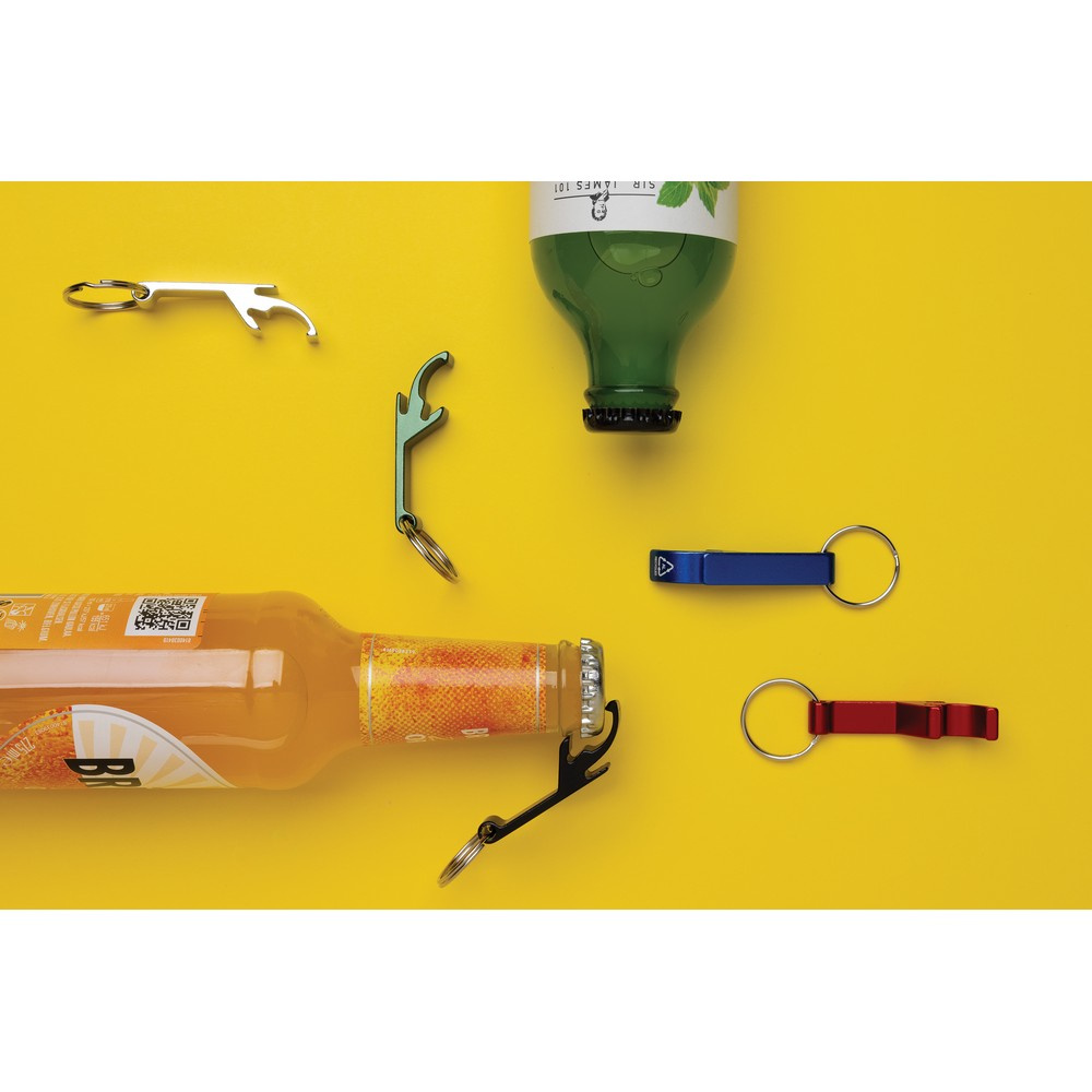 Otwieracz do butelek i puszek, wykonany z aluminium z recyklingu, całkowita zawartość materiałów z recyklingu obliczona w oparciu o wagę całkowitą przedmiotu: 79%