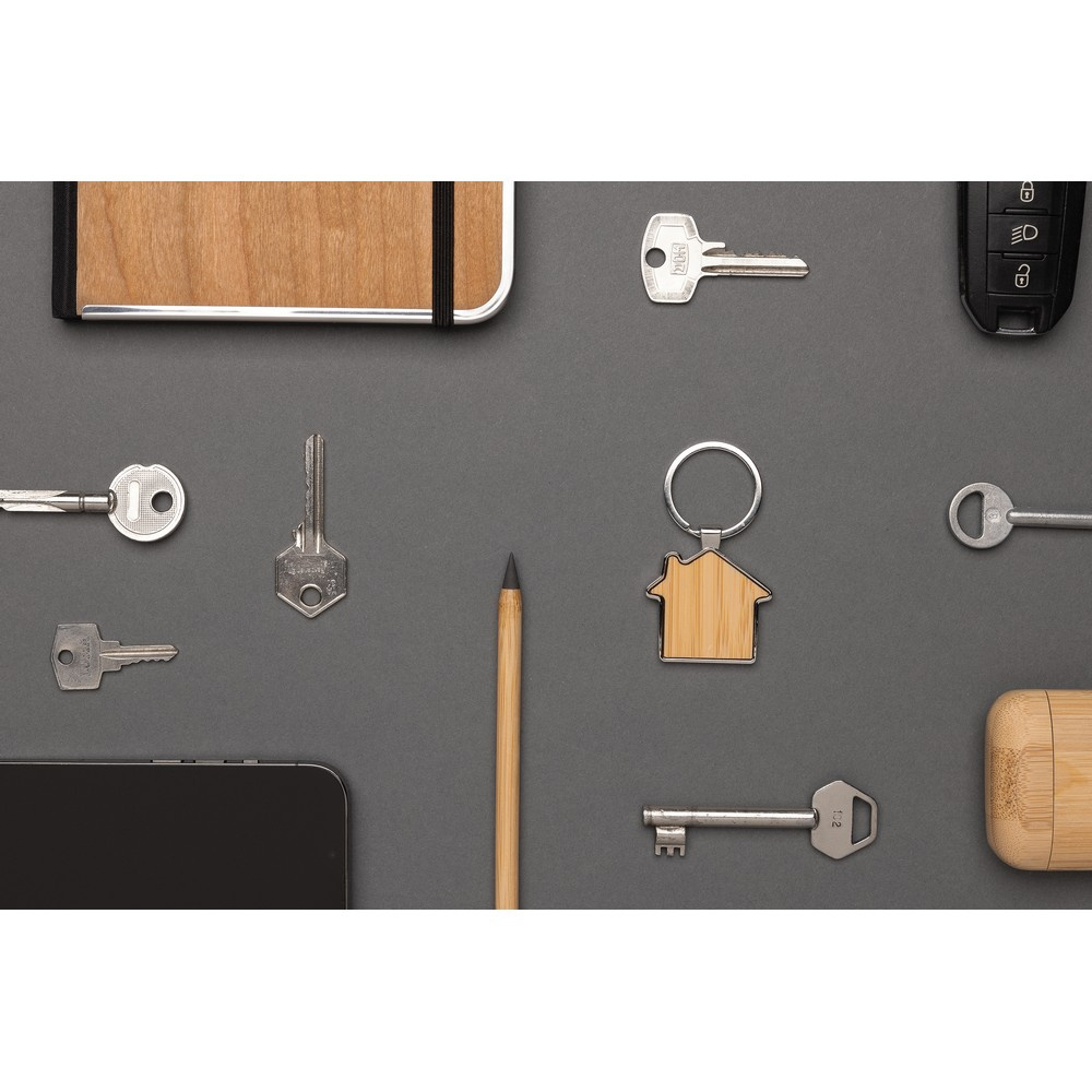 Brelok do kluczy „domek”, wykonany z metalu z recyklingu z certyfikatem RCS i bambusa, całkowita zawartość materiałów z recyklingu obliczona na podstawie wagi całkowitej