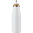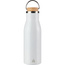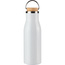 Butelka termiczna 500 ml, zakrętka z bambusowym elementem i metalowym uchwytem ułatwiającym noszenie lub przypięcie, ikona stali z recyklingu na produkcie,