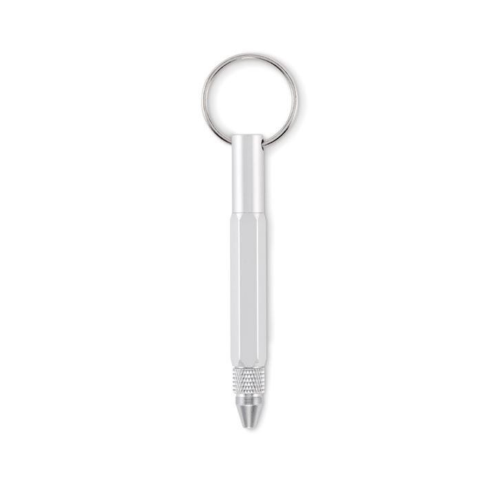 Brelok do kluczy z przekręcanym długopisem z aluminium pochodzącego z recyklingu z linijką 4 cm i 1,5 cala, rysikiem i śrubokrętem 2 w 1 z łbem krzyżakowym i płaskim. Czarny tusz.