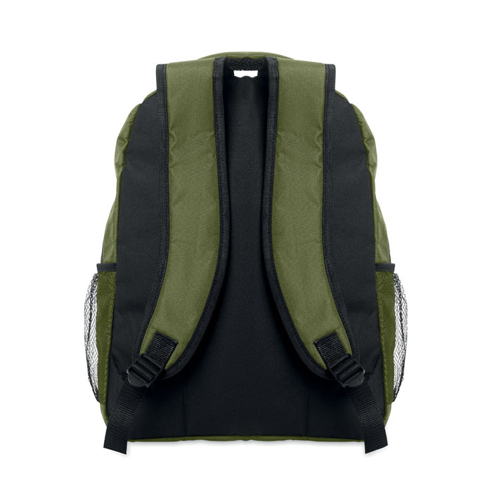 Plecak na laptopa 15 cali z poliestru 600D RPET z wyściełaną przegrodą na laptopa wewnątrz, kieszeniami z siatki po obu stronach i przednią kieszenią zapinaną na zamek.
