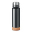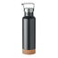 Dwuścienna, izolowana próżniowo butelka z recyklingowanej stali nierdzewnej z pokrywką z uchwytem i korkową podstawą.