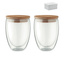 Zestaw wysokich, borosilikatowych szklanek z podwójnymi ściankami z bambusową pokrywką, z silikonowym pierścieniem.