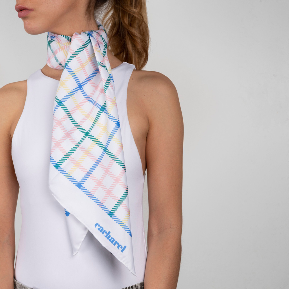 Apaszka w delikatną kratkę sprawdzi się jako idealne uzupełnienie każdej stylizacji, dostępna w trzech wariantach kolorostycznych i wykonana z wysokiej jakości poliestru.