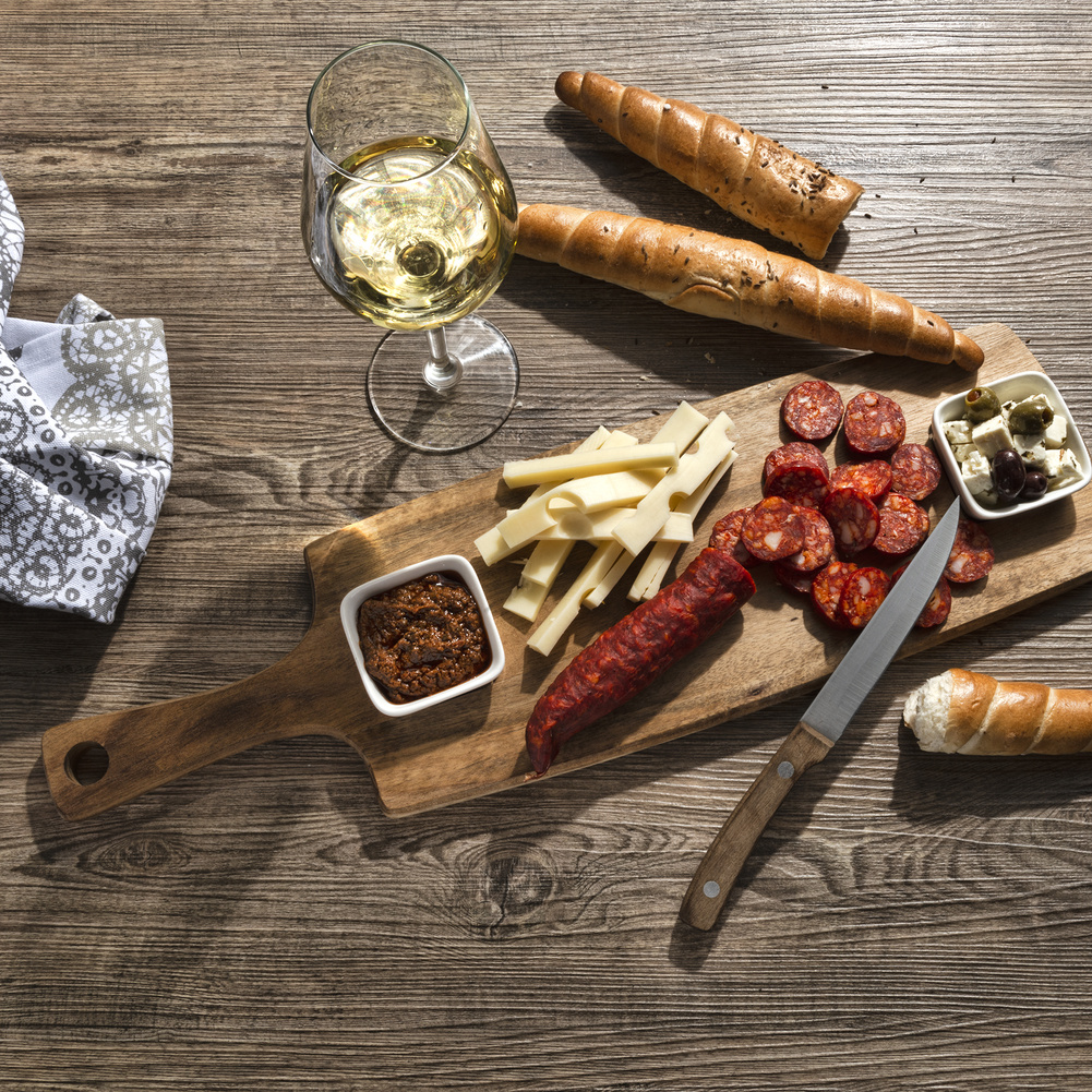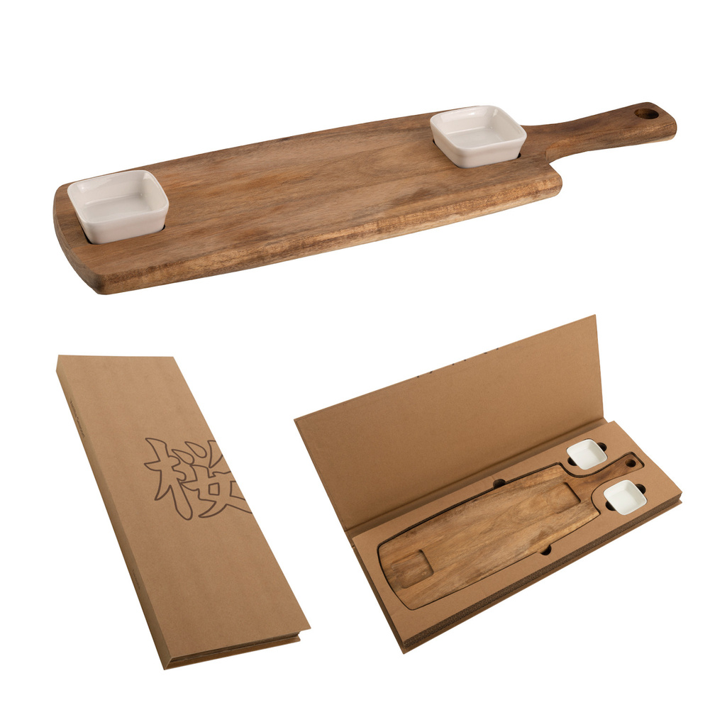 Praktyczny zestaw deski serwisowej wykonanej z drewna akacjowego i dwóch ceramicznych misek na sosy stanie się doskonałym uzupełnieniem Twojej kuchni. Serwuj różne rodzaje serów, wędlin i chleba na desce, a do tego podawaj sosy lub dodatki w małych miseczkach i ciesz się czasem spędzonym przy stole.