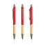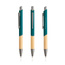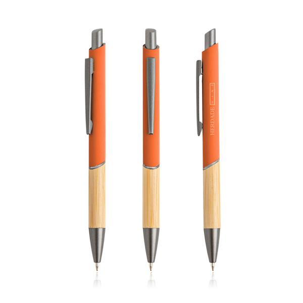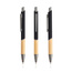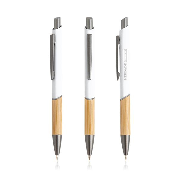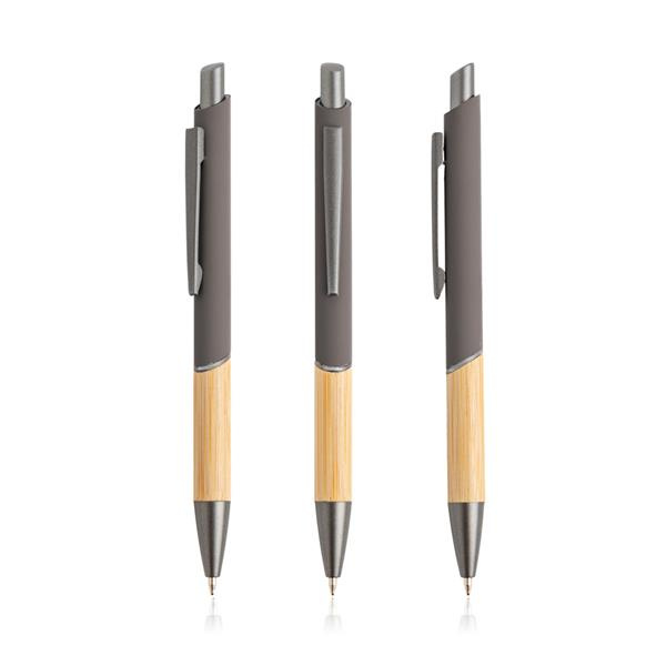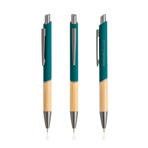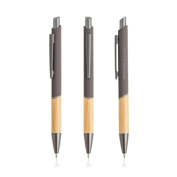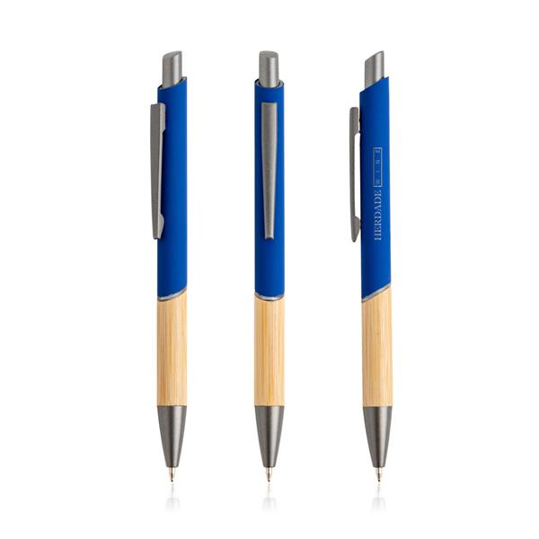 Ten długopis piszący na niebiesko ma nowoczesny design, łączący recyklingowany metal z gumową powłoką i naturalnym bambusem.
