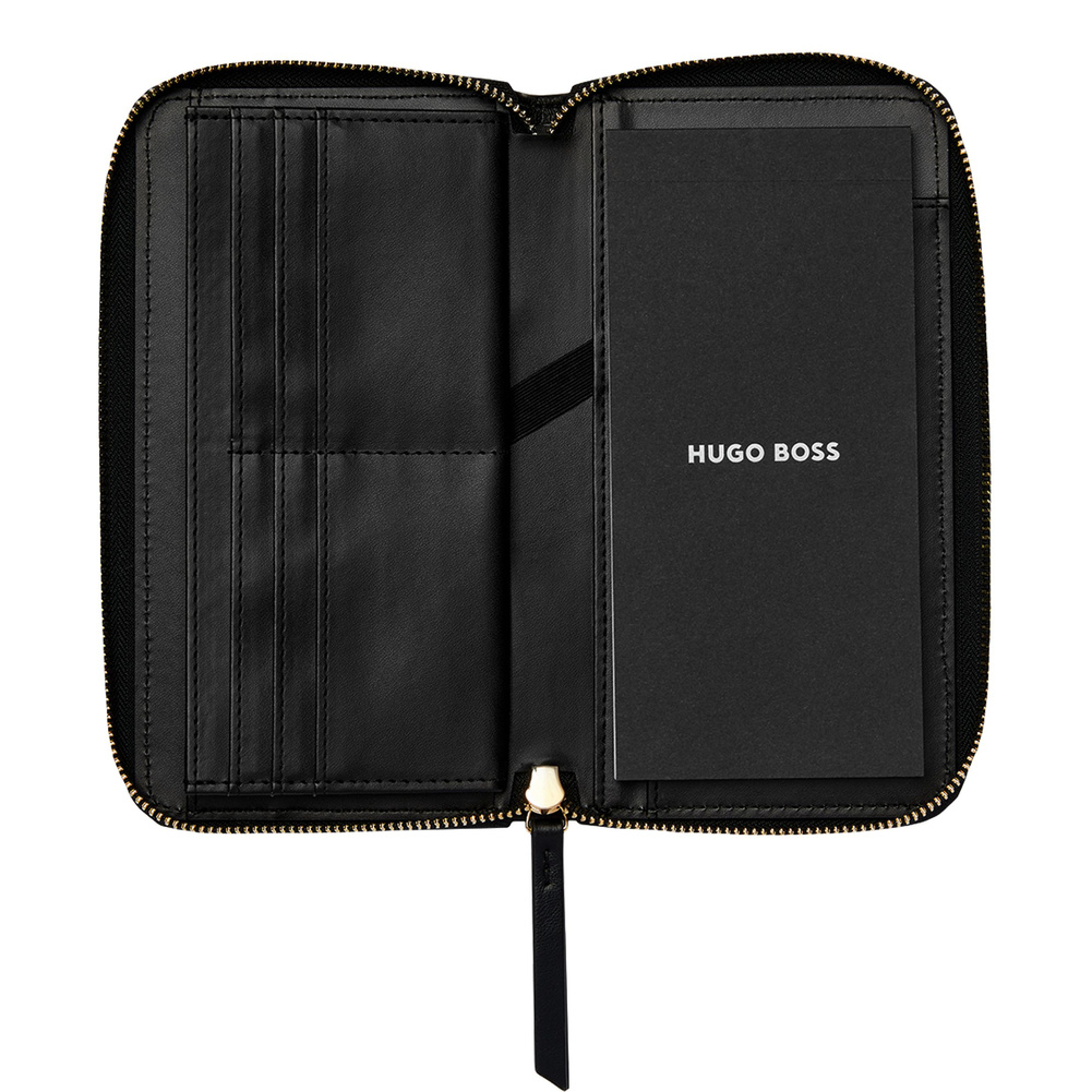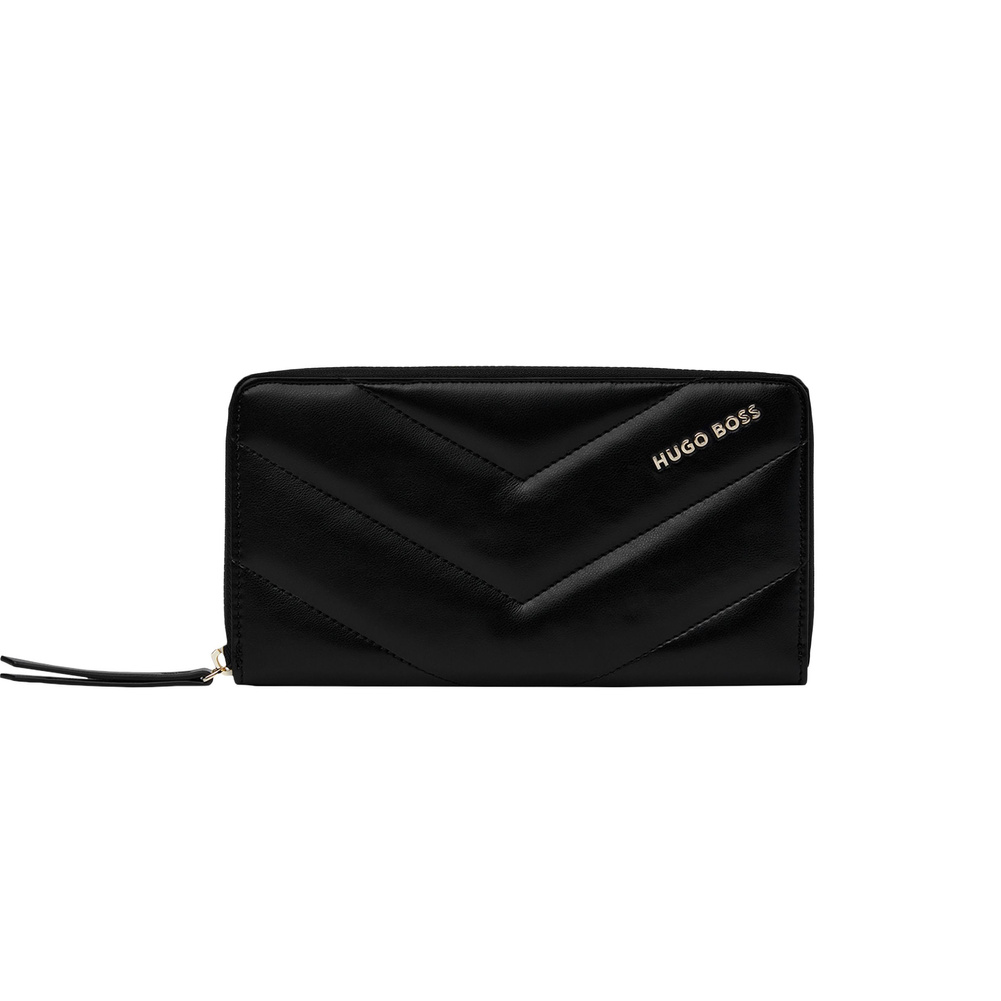 Kobiece i eleganckie teczki Triga są wzbogacone o luksusowe złote akcenty i matową fakturę skóry wegańskiej. Podpisane są piękną złotą płytką z logo HUGO BOSS, a ich powierzchnia jest pikowana geometrycznym i graficznym wzorem, czyniąc je jednocześnie nowoczesnymi i kobiecymi. Ta podłużna teczka będzie idealnym towarzyszem na co dzień, pozwalając na robienie notatek na jej papierowej podkładce, ale także posiadając kremowe wnętrze, które pozwoli na uporządkowanie wszystkich dokumentów i codziennych drobiazgów. Linia `Triga` jest idealna do łączenia i dopasowywania w kombinacje, które odpowiadają Twojemu gustowi, aby stworzyć skromne, ale wyrafinowane zestawy prezentowe.