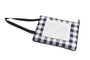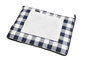 Koc ma niebiesko-biały pikowany wzór, w złożonym stanie zamykany na zamek błyskawiczny, posiada regulowany uchwyt do noszenia oraz białą kieszonkę o wymiarach 24 × 32 cm.