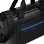 Jasnoniebieskie akcenty są wprowadzone przez przedni zamek błyskawiczny, krawędź suwaków i logo, tworząc odważny kontrast z minimalistyczną czarną podstawą.