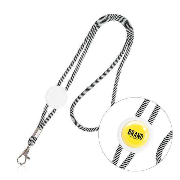 Regulowana smycz z karabińczykiem wykonana z poliestru. Logo umieścimy w kółku o średnicy 2,5 cm.