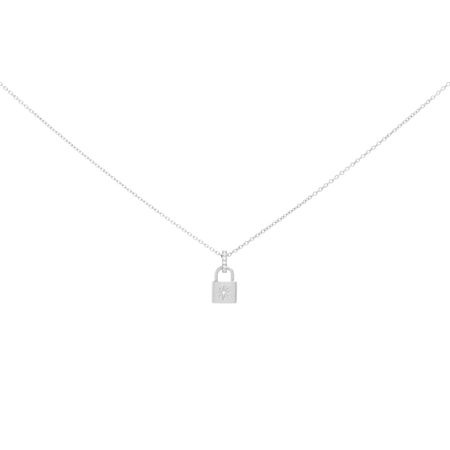 Naszyjnik posiada efektowną zawieszkę z zamkiem, której ogniwo wysadzane jest subtelnymi, ale świecącymi kryształami.