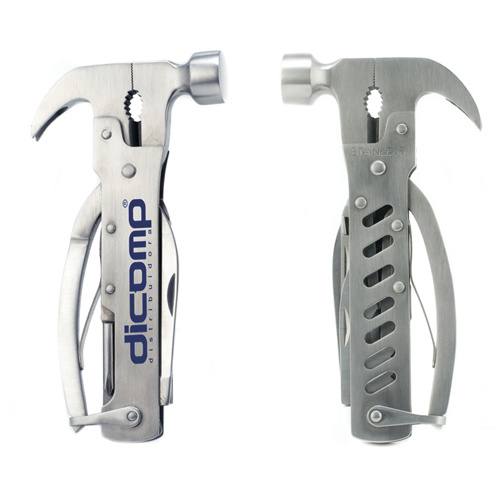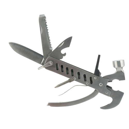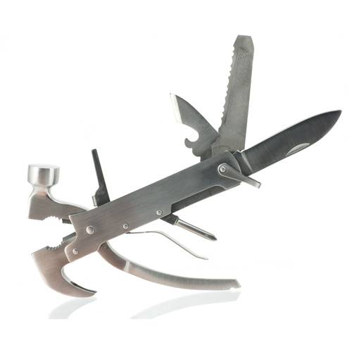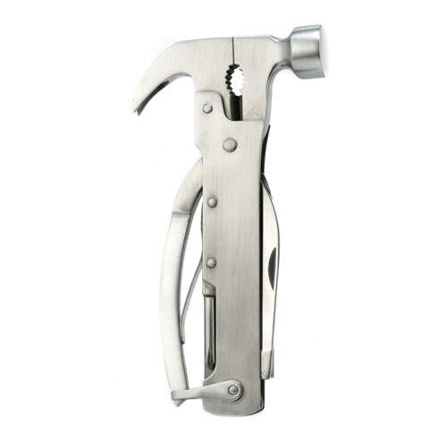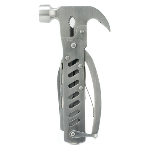 Sprytne urządzenie wielofunkcyjne! 7 funkcji w jednym narzędziu! W tym jednym gadżecie ze stali nierdzewnej znajdziesz młotek, kombinerki z funkcją cięcia, końcówkę do wyciągania gwoździ, śrubokręt krzyżakowy, nóż, piłkę, pilnik oraz otwieracz do konserw. Przyrząd zapakowany jest w czarne materiałowe etui ze szlufką, dzięki której urządzenie można zawiesić na pasku.