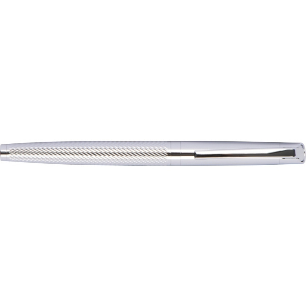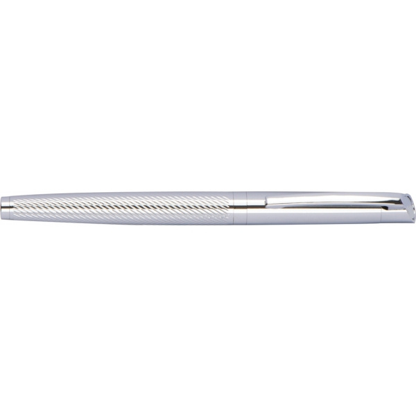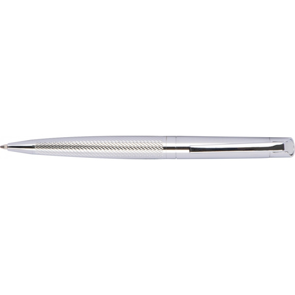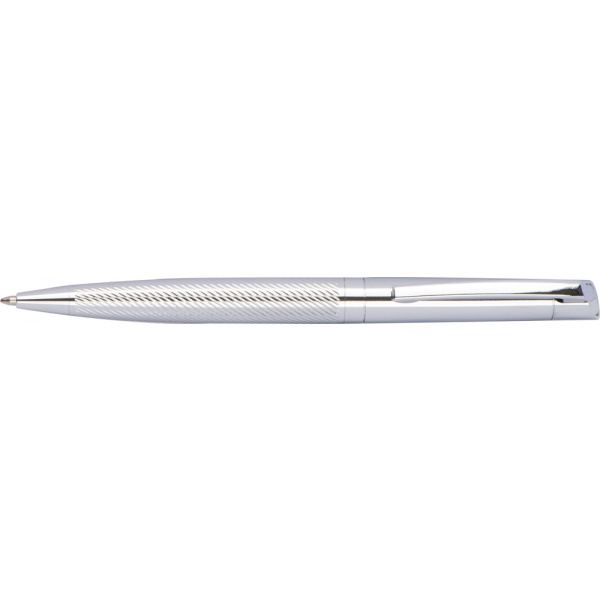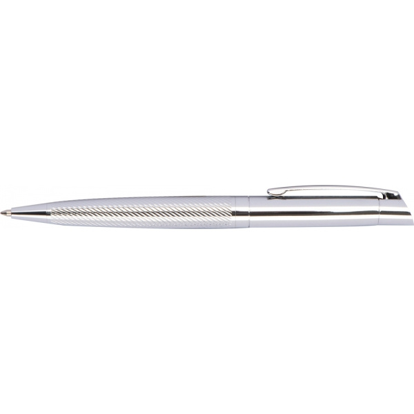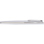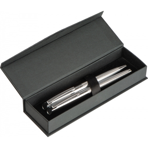 Zestaw piśmienniczy wykonany z błyszczącego chromowanego metalu, składający się z długopisu i pióra kulkowego, oba elementy piszą na niebiesko.