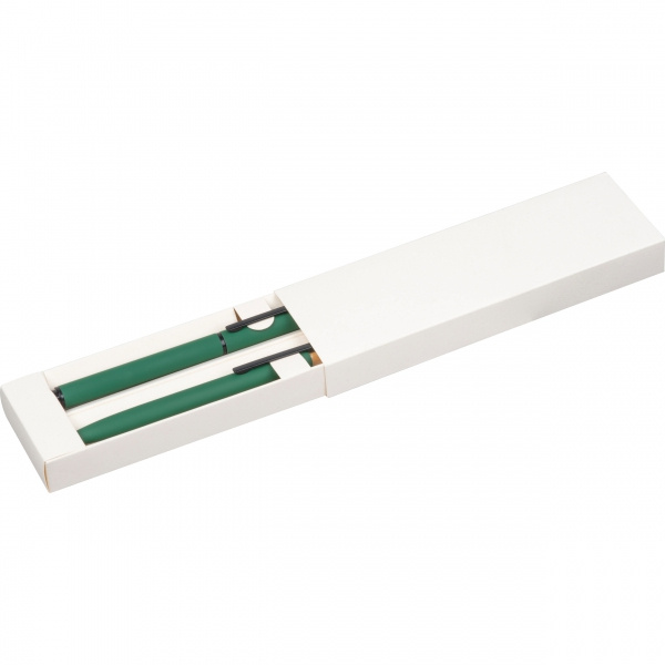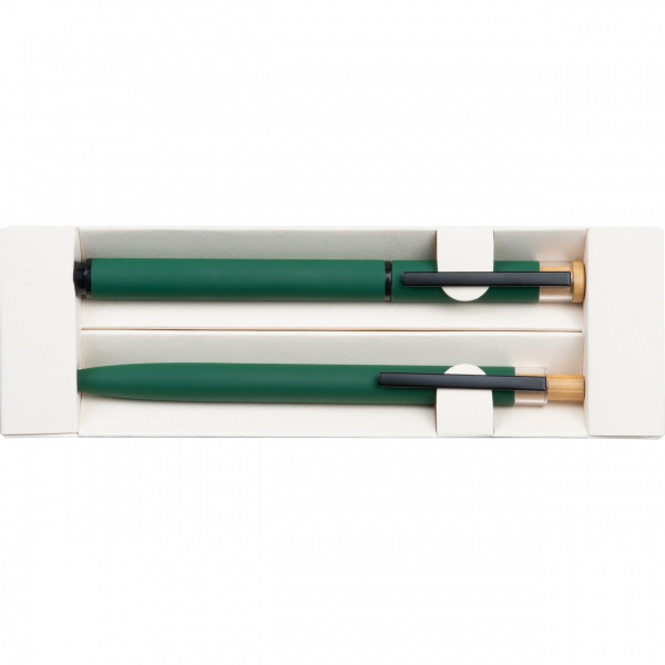 Zestaw piśmienny składający się z piszącego na niebiesko długopisu i pióra kulkowego, wykonany z aluminium z recyklingu.