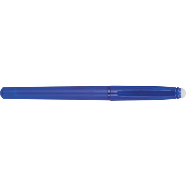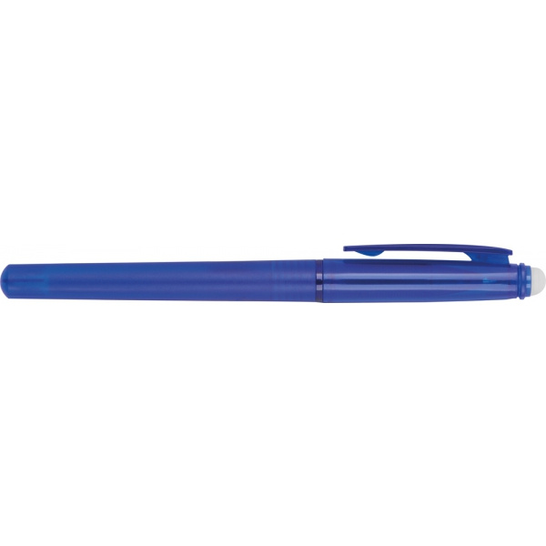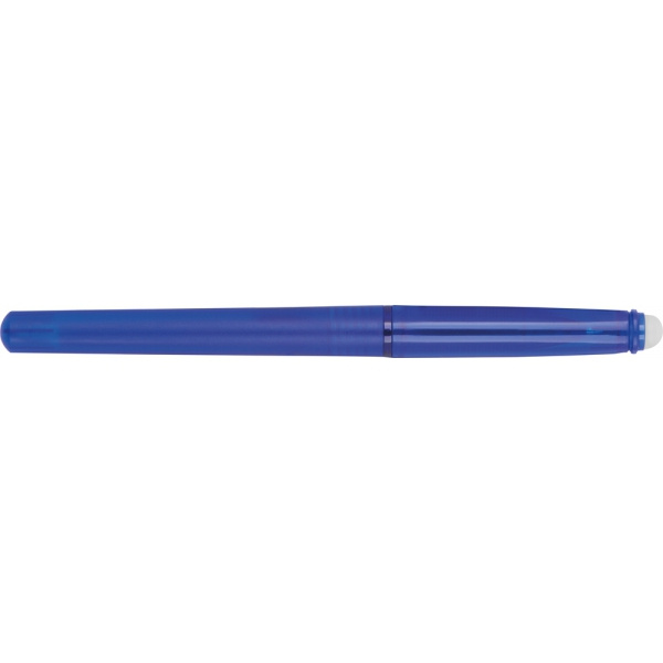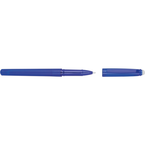 Plastikowy długopis z żelowym wkładem i gumką do mazania w zatyczce.
