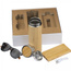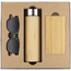 Przyjazny środowisku zestaw bambusowy, w skład którego wchodzi butelka ze stali nierdzewnej z zaparzaczem, okulary przeciwsłoneczne oraz power bank o pojemności
