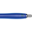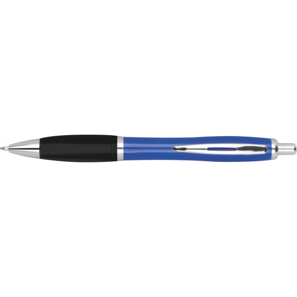 Plastikowy długopis z gumową strefą uchwytu oraz dużym niebieskim wkładem.